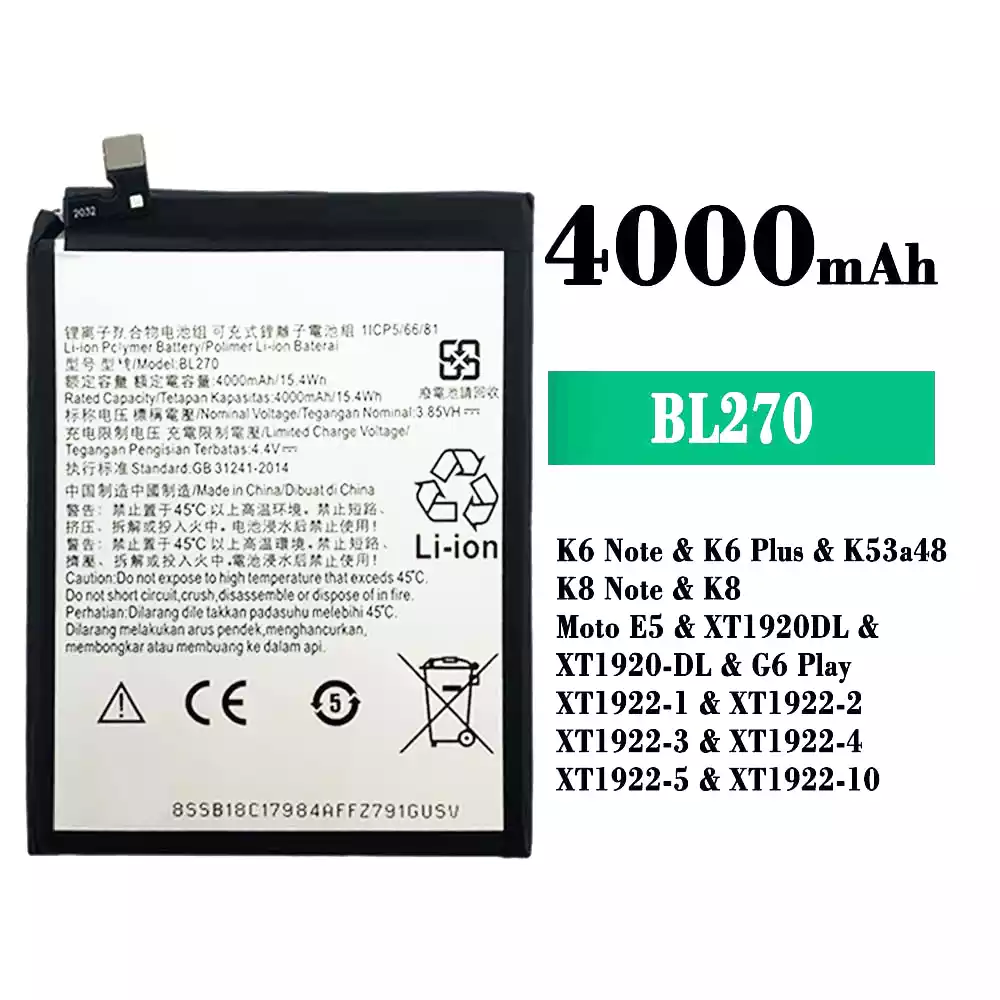 แบตเตอรี่ BL270 สำหรับรุ่น Lenovo K6 Note / K6 Plus / K53a48 / K8 Note / K8 / Moto E5 / XT1920DL / XT1920-DL / G6 Play / XT1922-1 / XT1922-2 / XT1922-3 / XT1922-4 / XT1922-5 / XT1922-10